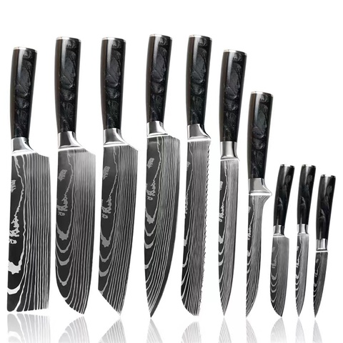 Juego de cuchillos de chef de cocina con diseño láser de Damasco, mangos de resina, color negro, profesional, alta calidad